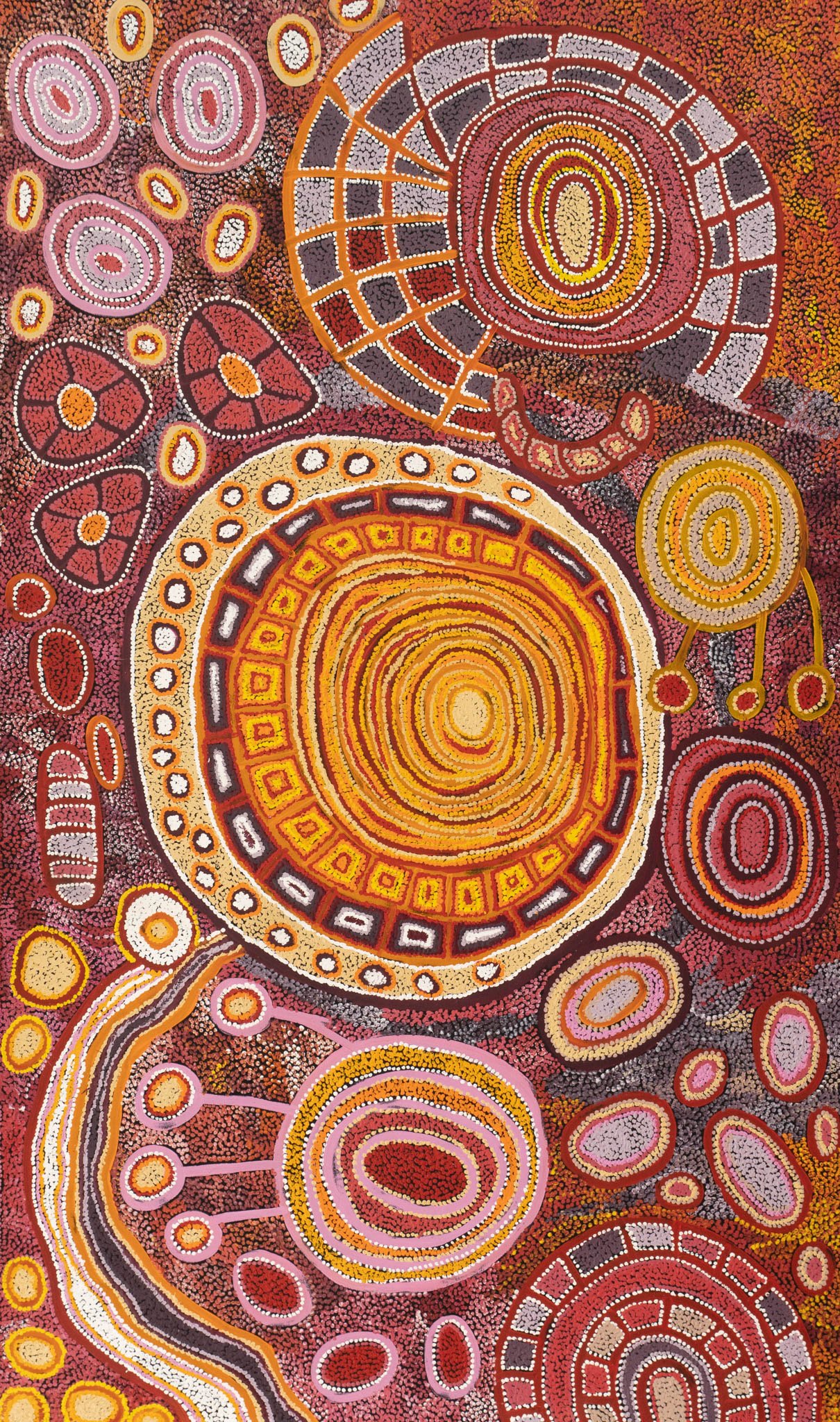 In this artwork Samantha paints the traditional homelands associated with her ancestral heritage. These include the waterhole sites of Yumari, Punkilpirri and Tjalili. These sites are important for ceremonies and as reliable sources for water and edible plants. The lines that connect these sites are ancestral pathways or song lines. These were established as an indicator for the passage from one site to the next during ceremony.