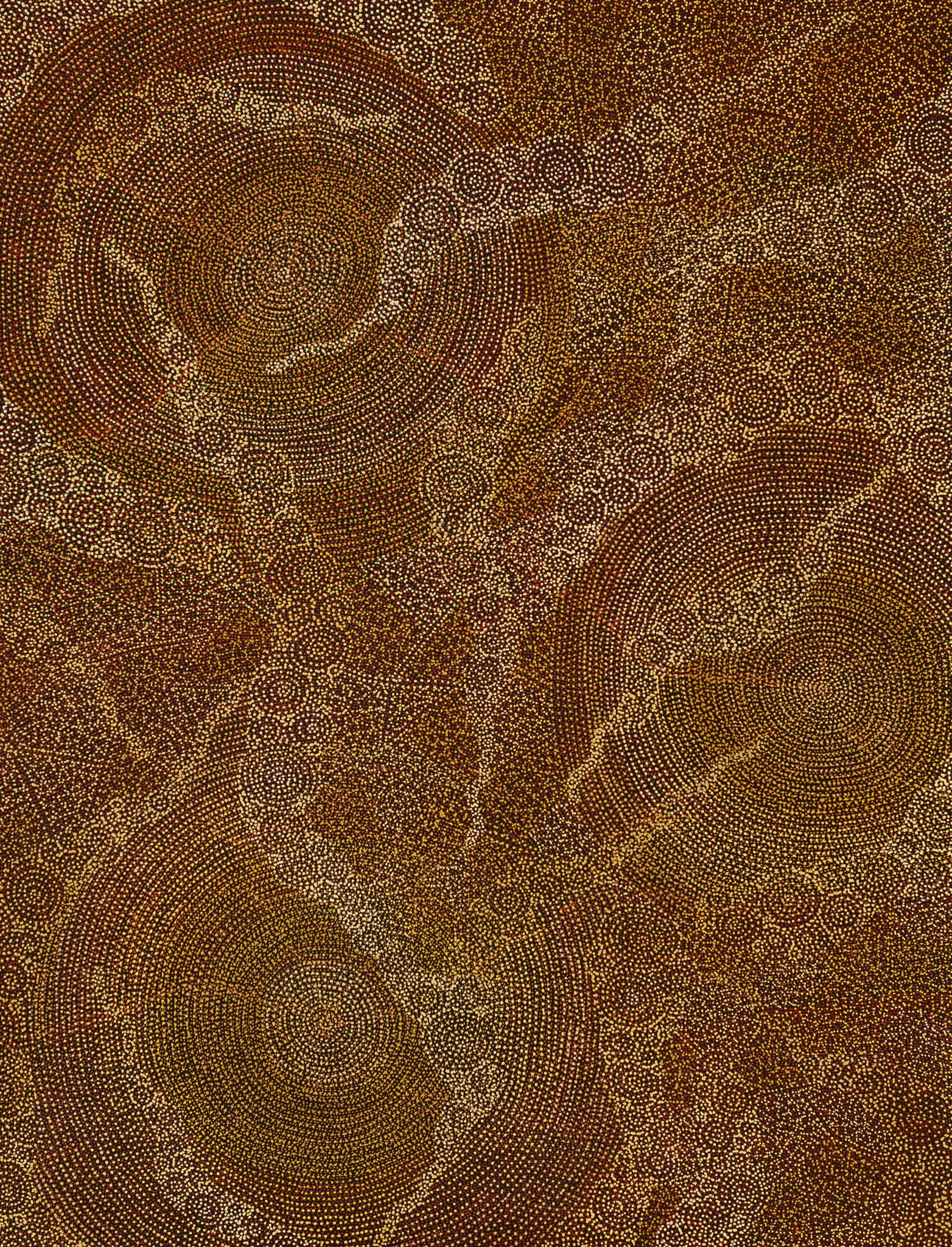 Sarrita shares the stories of her ancestors. Painted in layers, the ancestors series focuses on those who have passed on, yet guide our path today. Markings made on the land over thousands of years can be seen entangled with patterns covering the land today, such as sand hills, flora and paths made by humans and animals. Beneath the land are the waterways which have been virtually constant over time feeding the land, the flora, fauna and humans. These are the same waterways that supplied our ancestors which are now one with the land.