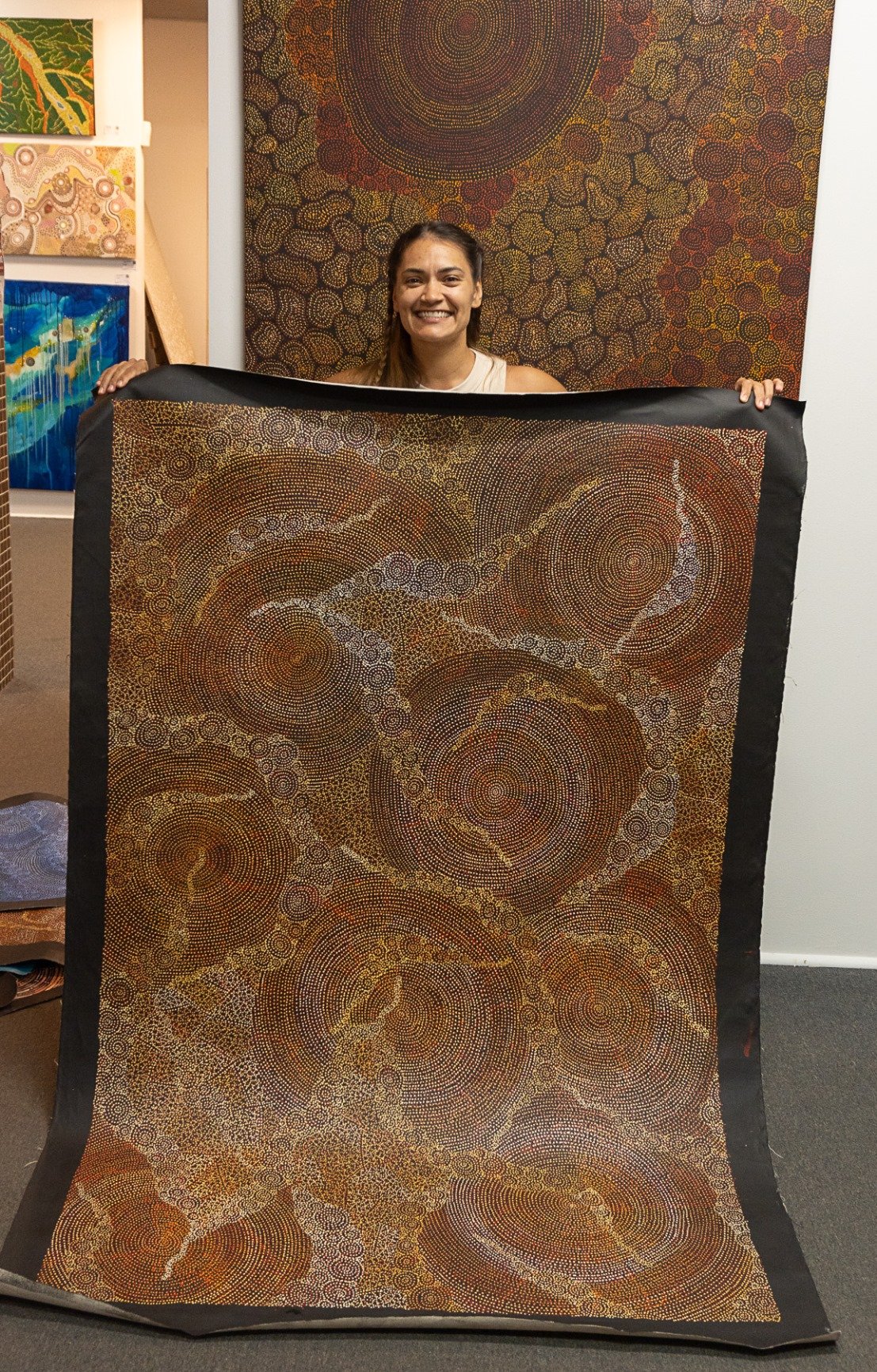 After 3 years living and painting in Canberra, Sarrita and her husband returned back to Darwin in 2017 where she spent most of her childhood and welcomed their first child Steele. In late 2018, her second son Grange was born. At only 34, Sarrita King has many personal achievements but it is her desire to visually communicate her inspiration and the land, which keeps her ancestral narrative alive and provides a new way of looking back while looking forward.