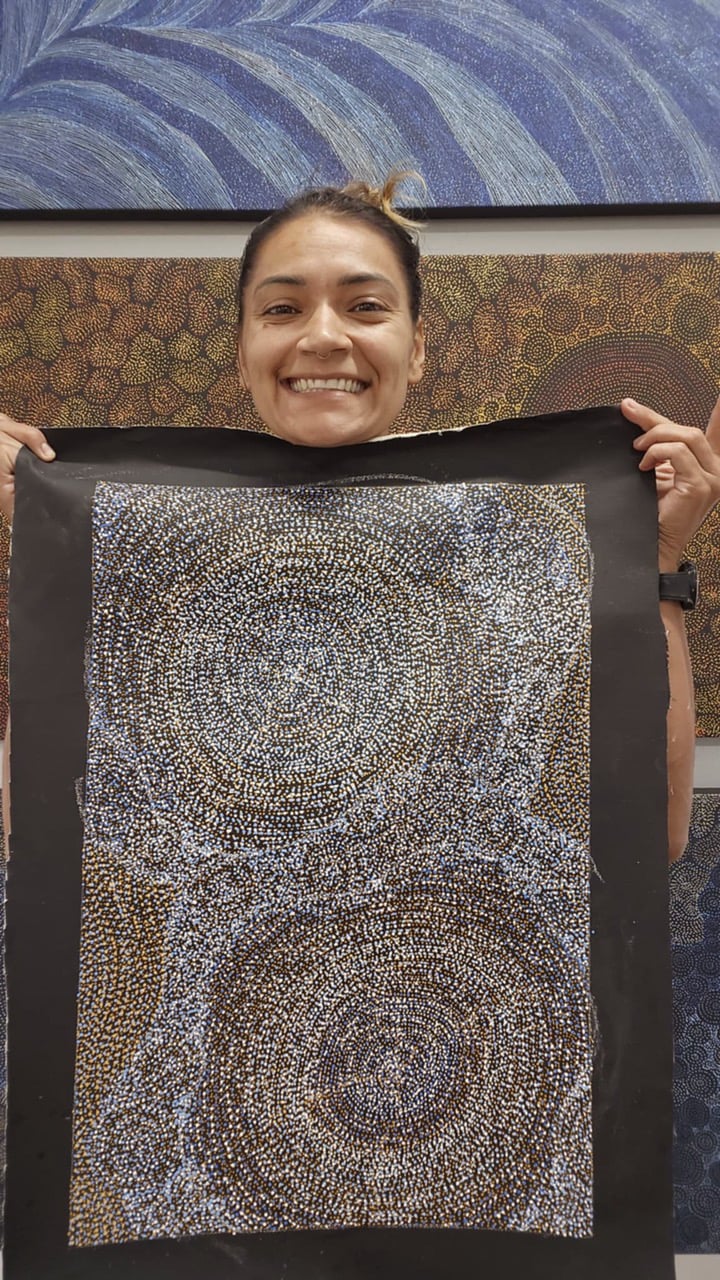 After 3 years living and painting in Canberra, Sarrita and her husband returned back to Darwin in 2017 where she spent most of her childhood and welcomed their first child Steele. In late 2018, her second son Grange was born. Sarrita King has many personal achievements but it is her desire to visually communicate her inspiration and the land, which keeps her ancestral narrative alive and provides a new way of looking back while looking forward.