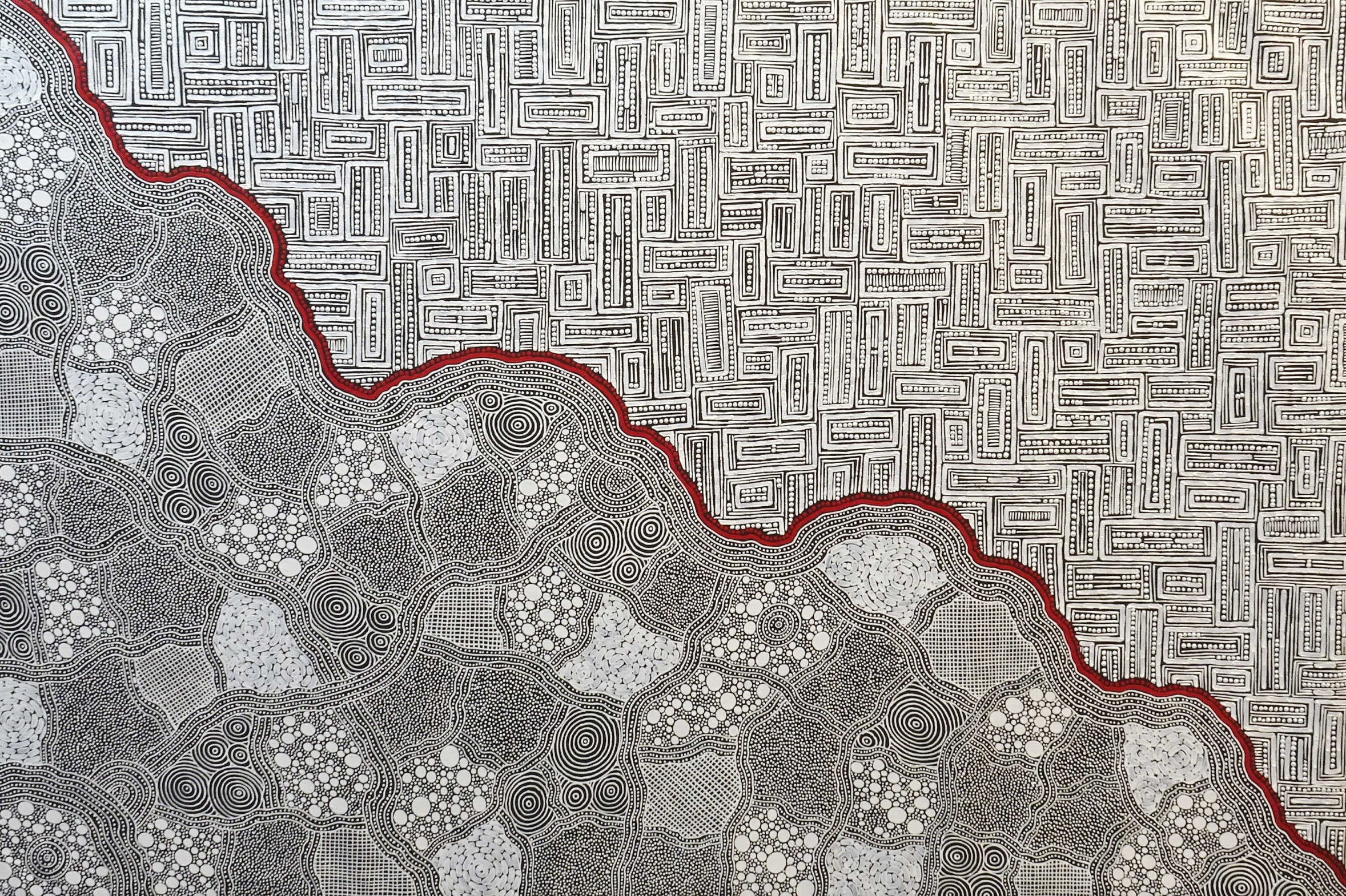 This special piece is a collaborative work by sisters Tarisse King and Sarrita King. This is the earth’s story. It is also the story of black and white upon the land and the history we have created and carved into it by our interactions with one another. The intersections of black and white culture and how they meet, creating a narrative in the land and in history, and then moving on in their individual and collaborative journeys are abstractly depicted. In an abstract way Sarrita references the iconography of the Tingari creation ancestors with her use of strong rectangles. These are then given body with dots and dashes, similar to Morse code. These symbols of communication are haunting in their familiarity, like an ancient language that was once known but now sits dormant at the back of one’s memory. Overall the effect is a sense of the land being torn away to reveal the Earth’s ancient stories.
