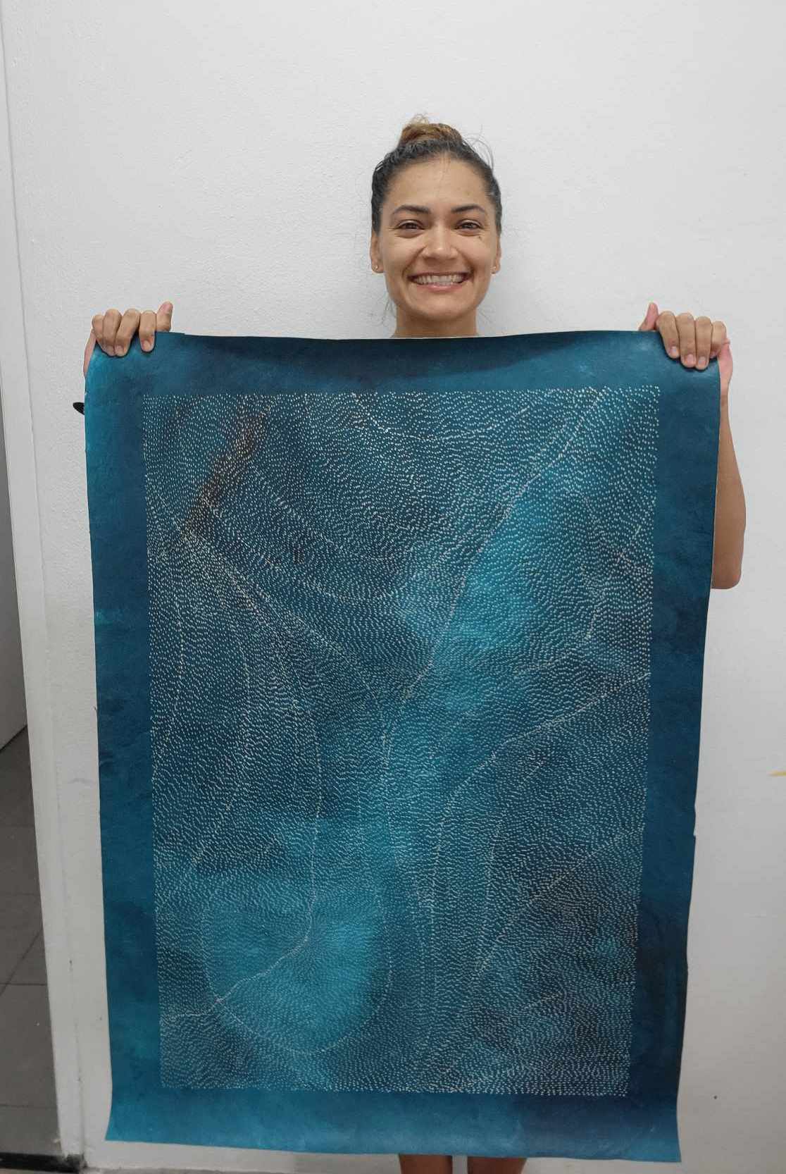 Sarrita inherits her Australian Aboriginality from her father who was part of the Gurindji tribe from the Northern Territory. The Gurindji tribe came to public attention during the 1960s and 1970s when members employed by the Wave Hill cattle station led a landmark case which became the first successful land rights claim in Australia. It is this same strong sense of self and pride that Sarrita embodies and it fuels her drive to paint her totemic landscape.