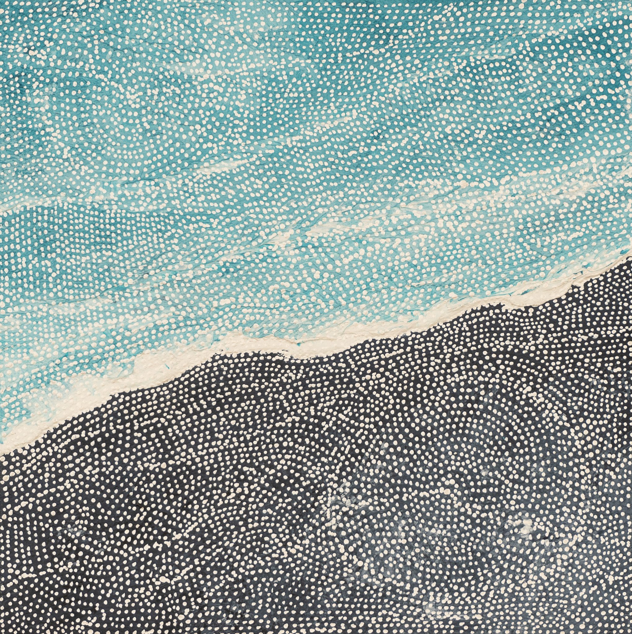 This painting is inspired by the elements. Growing up in Darwin Sarrita has always been in awe of the changing seasons and the change in the elements such as Water and Earth. In this painting Sarrita draws on the beautiful waterways and fresh water pools found throughout the Northern Territory. It is especially fascinating to see the fresh water pools meet the land, feeding the Earth and flora.