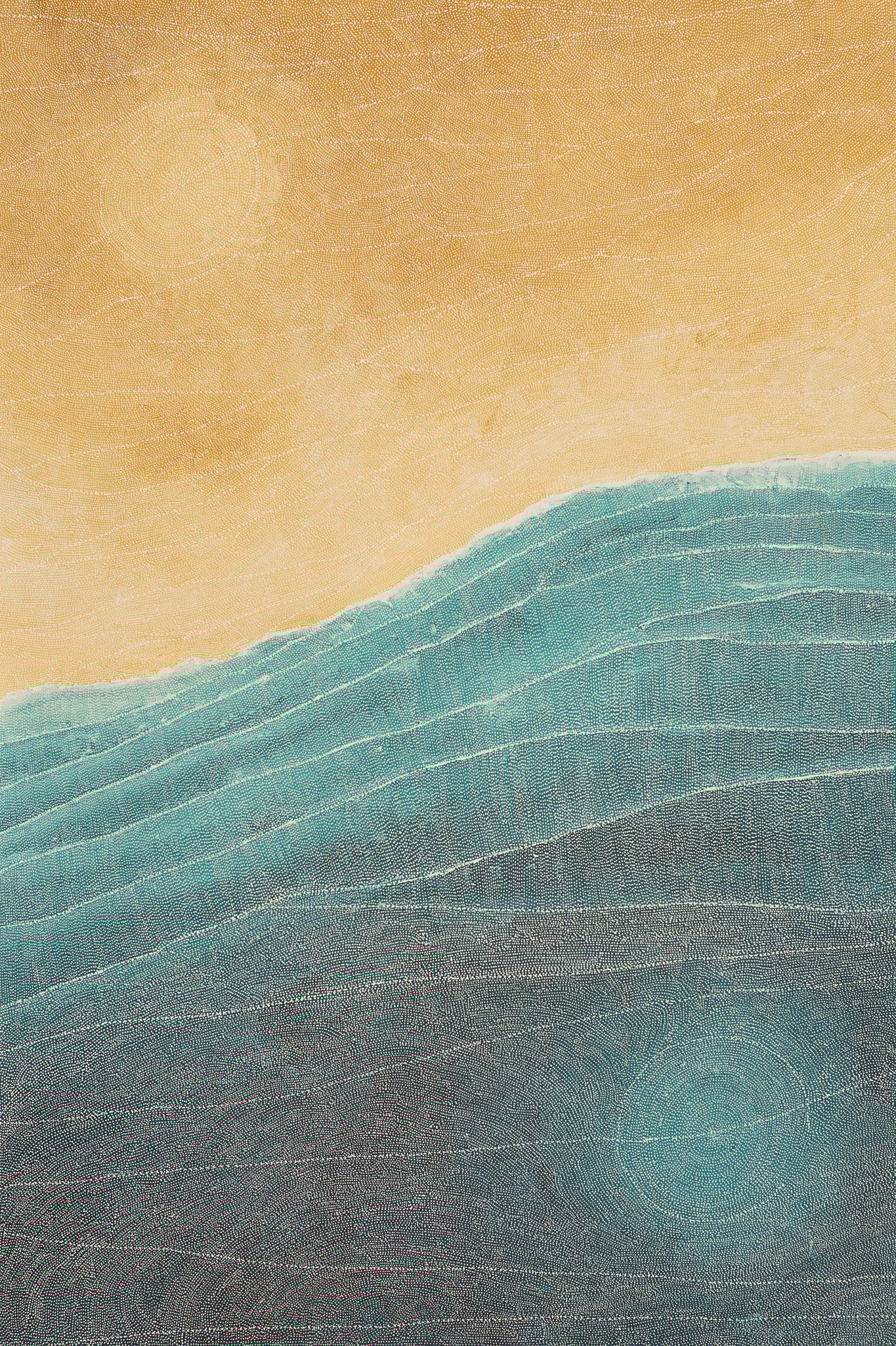 In this painting Sarrita draws on the beautiful waterways and fresh water pools found throughout the Northern Territory. It is especially fascinating to see the fresh water pools meet the land, feeding the Earth and flora.