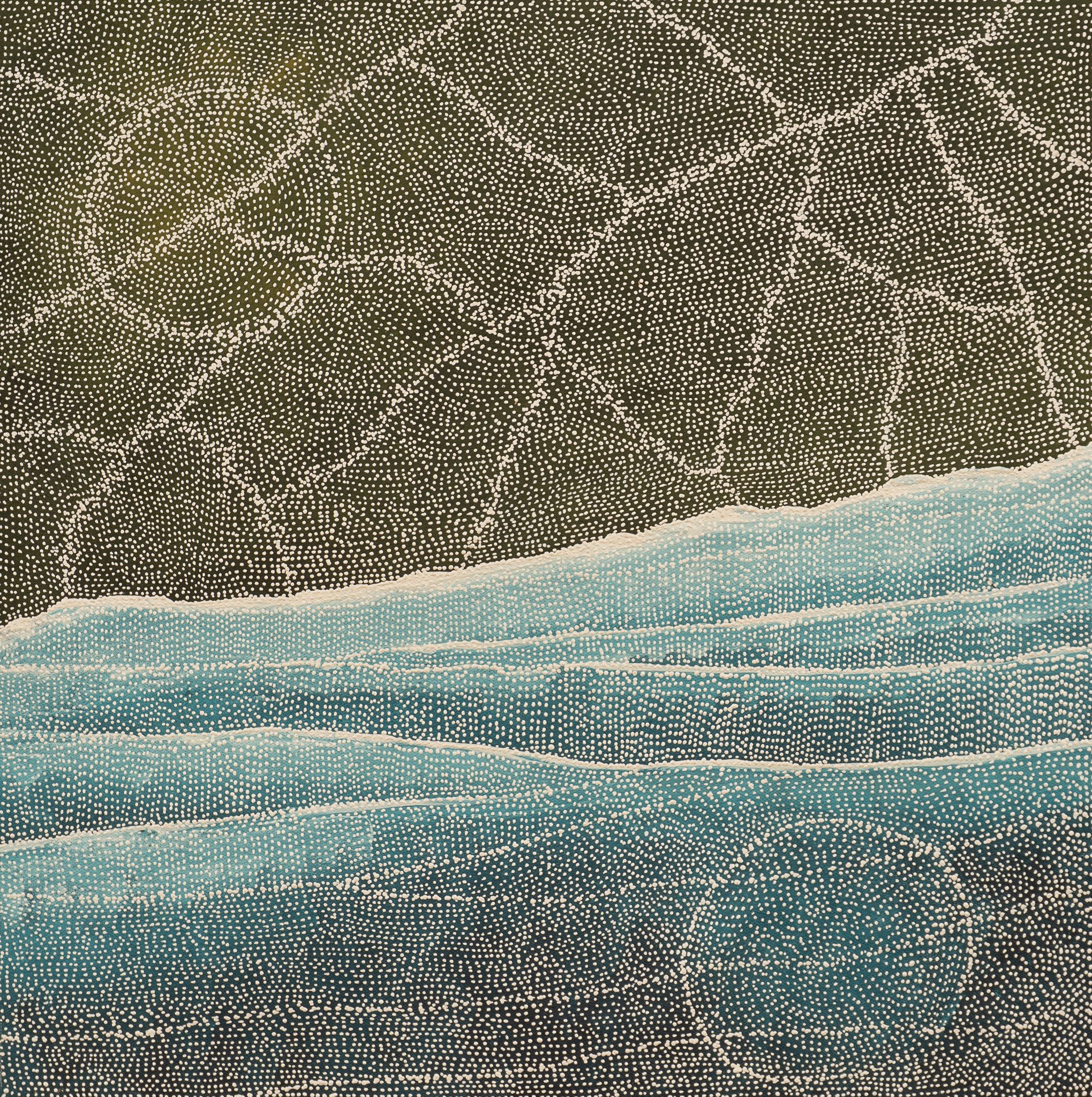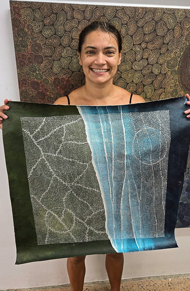 In this painting Sarrita draws on the beautiful waterways and fresh water pools found throughout the Northern Territory. It is especially fascinating to see the fresh water pools meet the land, feeding the Earth and flora.