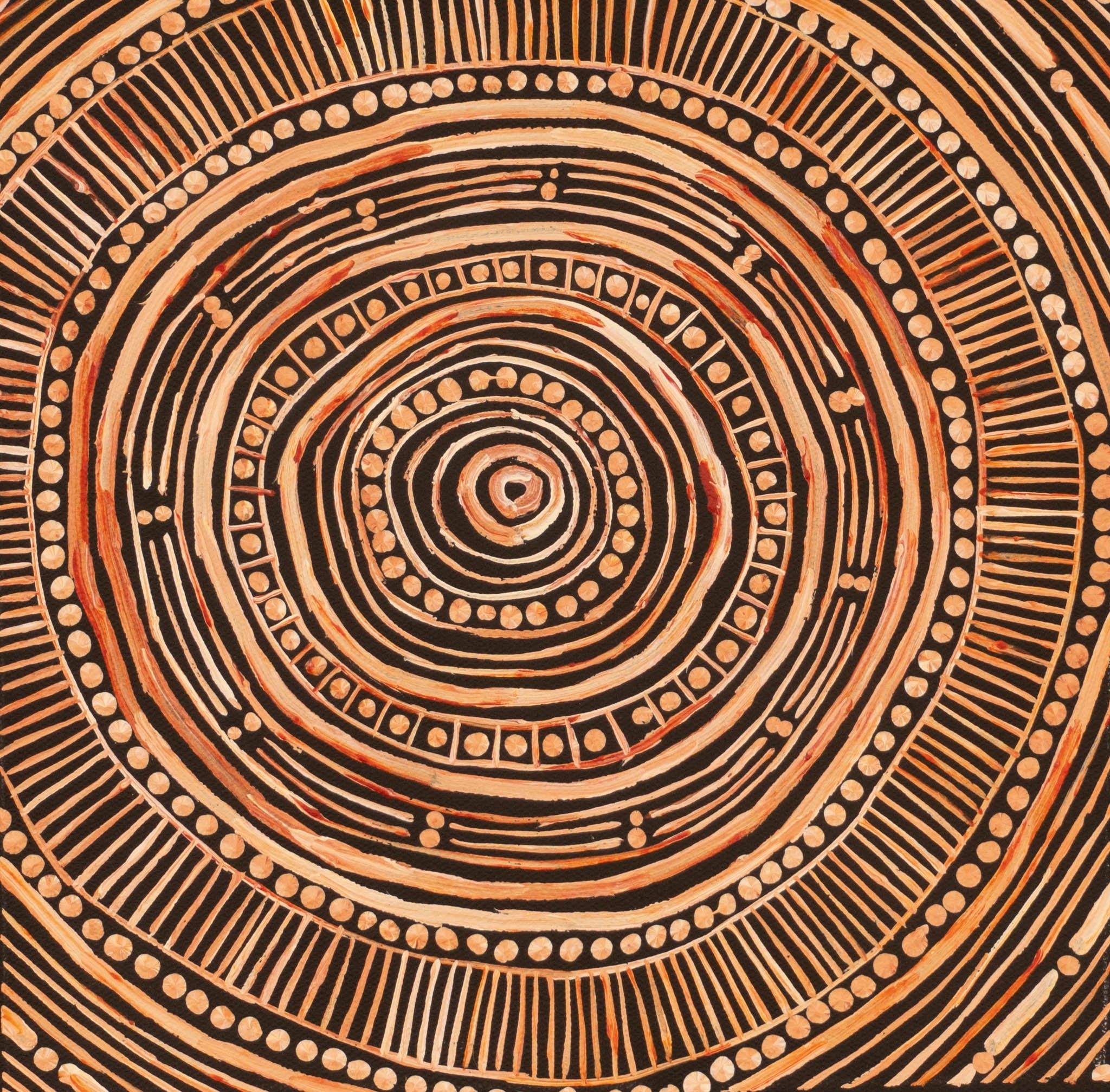 This is the earth’s story. The intersections of black and white culture and how they meet, creating a narrative in the land and in history, and then moving on in their individual and collaborative journeys are abstractly depicted. In an abstract way Sarrita references the iconography of the Tingari creation ancestors with her use of strong lines and shapes. These are then given body with dots and dashes, similar to Morse code. These symbols of communication are haunting in their familiarity, like an ancient language that was once known but now sits dormant at the back of one’s memory. Overall the effect is a sense of the land being torn away to reveal the Earth’s ancient stories.