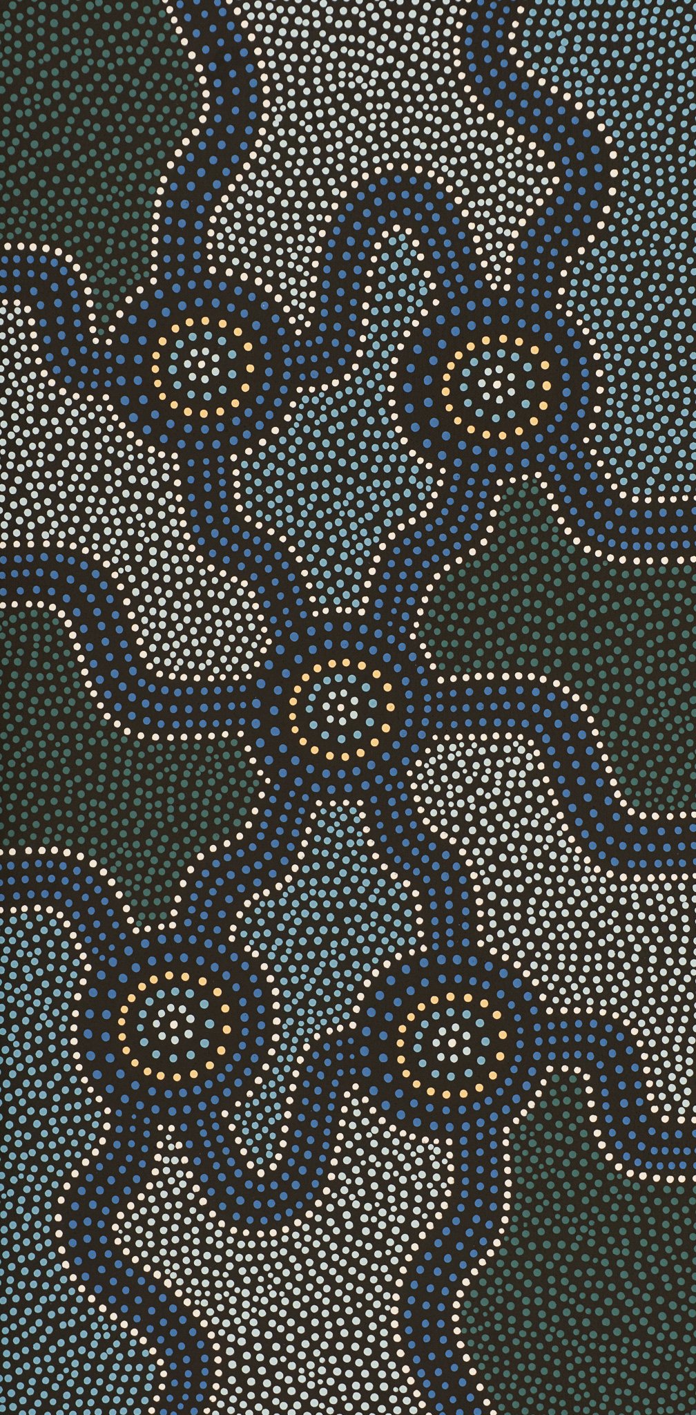 This painting represents my Country. The circles symbolise family groups and clans, with the tracks showing their connection to other Aboriginal groups within the nation. Our people live in harmony with the land and sea. We hold a deep belief in our Aboriginal spirituality — that our life cycle evolves with and is connected to everything in the universe. Aboriginal people respect the land and sea, the animals, birds, and fish. As an artist, I’ve expressed my life journey through my work — sharing stories about my people and, in particular, our ongoing struggle to be recognised and respected as the original inhabitants of this land.