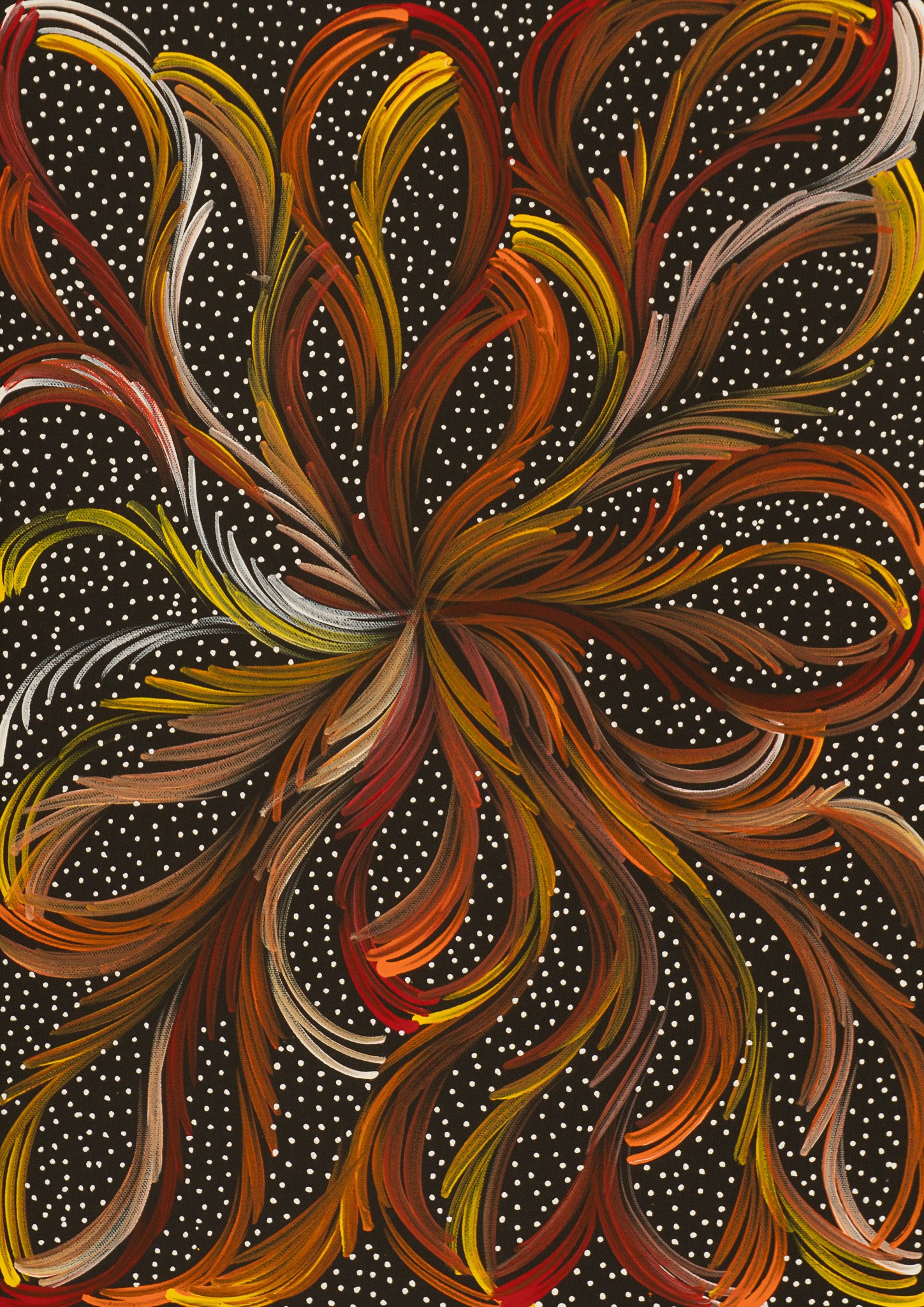 Selina’s family come from a long line of desert artists of the contemporary Aboriginal art including world renowned aunties, the late Gloria and Kathleen Petyerre. Many women from the Petyerre, Mbtitjana and Numina family name hold custody and are knowledge keepers of stories such as Bush Medicine Leaves, Bush Tucker, Seeds, Soakages and Women’s Ceremony, in common with other skin groups across the vast arid landscape and desert areas of central Australia.