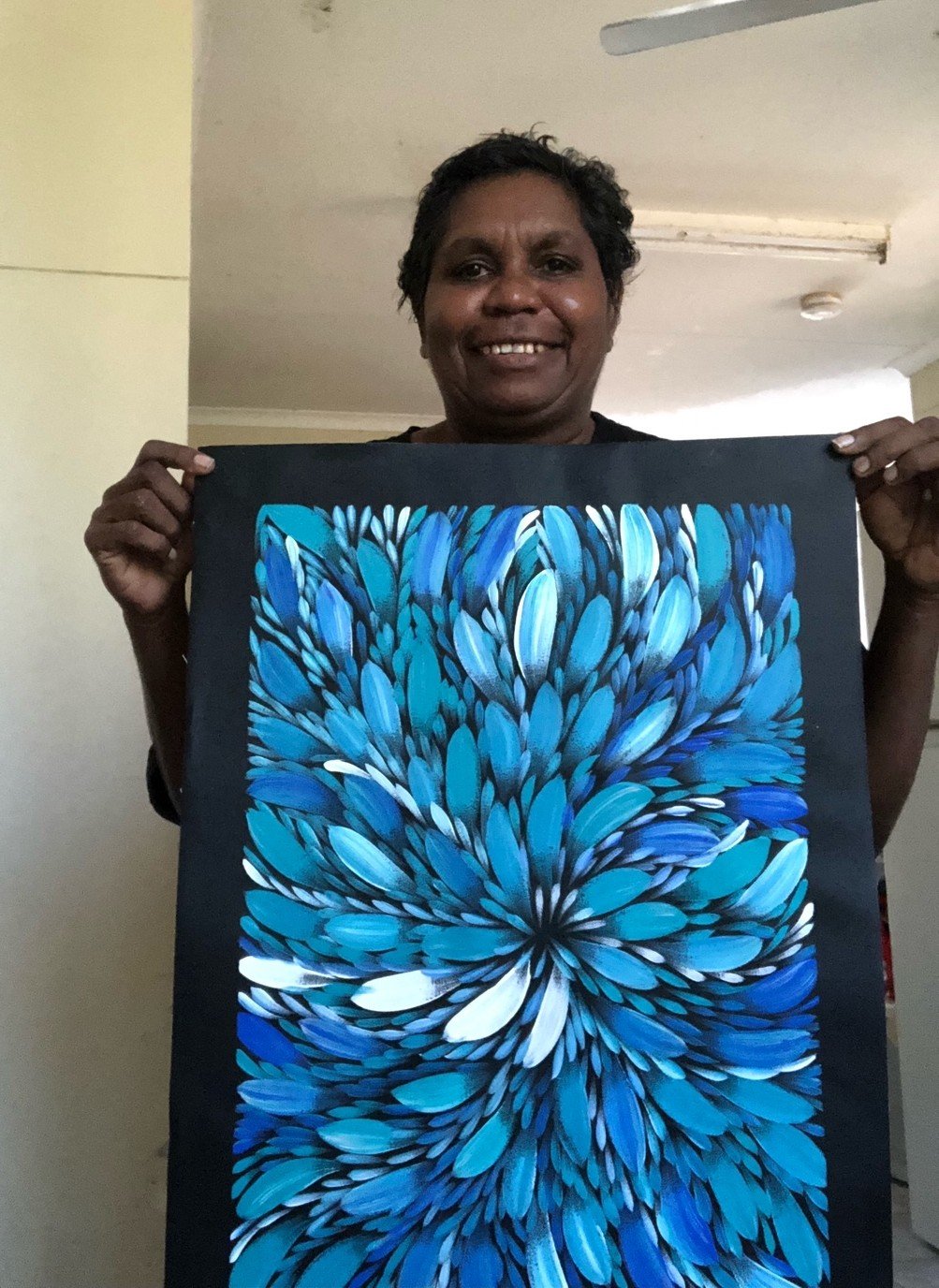 Selina Numina was born in 1978 and is the daughter of Barbara Price Mbtitjana who is an elder painter and cultural elder from Stirling Station. Selina has five sisters, Jacinta, Lanita, Louise, Caroline and Sharon Numina, who are also well respected artists from Utopia. Selina, along with her sisters and brothers were sent to boarding school in Darwin as no secondary schooling was available in Tennant Creek, 500kms north of Alice Springs. The family now live in Darwin and often travel back to Ti Tree and Stirling Station in the north Utopia region near Tennant Creek.