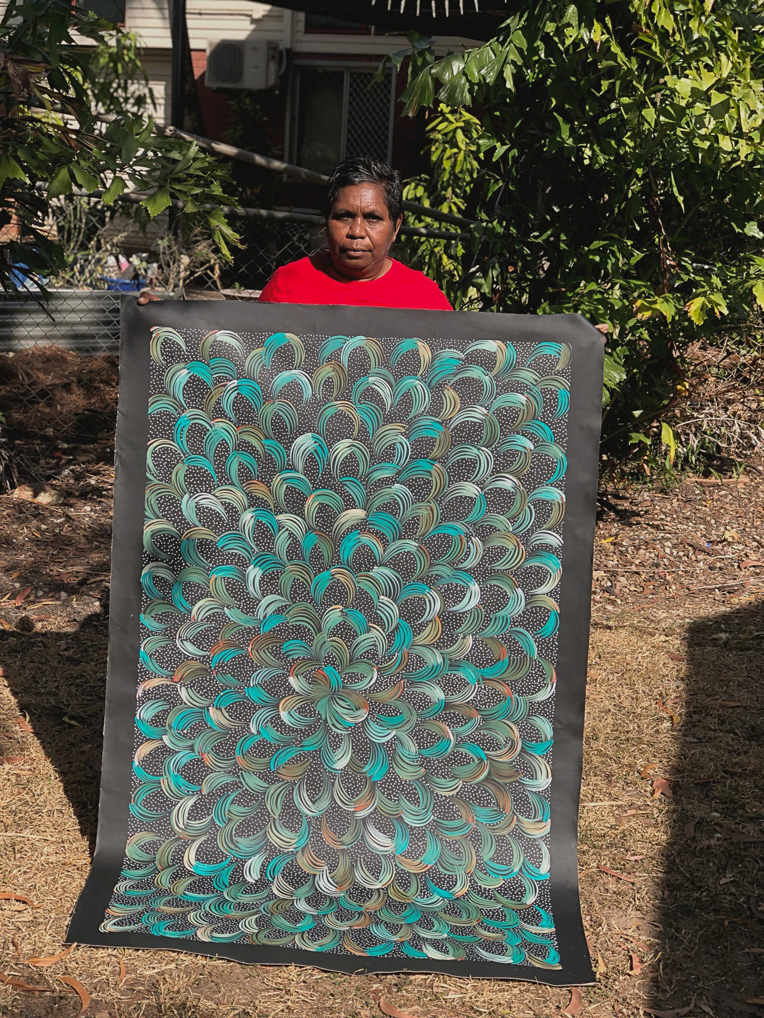 Knowing, carrying and reinforcing these stories gives respect for Country and ancestors and shows responsibility and care of holding such stories to keep the stories and traditional practices alive. The knowledge must be retold repeatedly and handed on. The Numina Sisters have all been taught to paint by their earlier elder painter grandmothers, mother-aunties, and cousin-sisters connected across the Central Desert region. Their mother’s and grandmother’s Country is in the bush and remote Stirling Station. Their father is from Utopia community side.