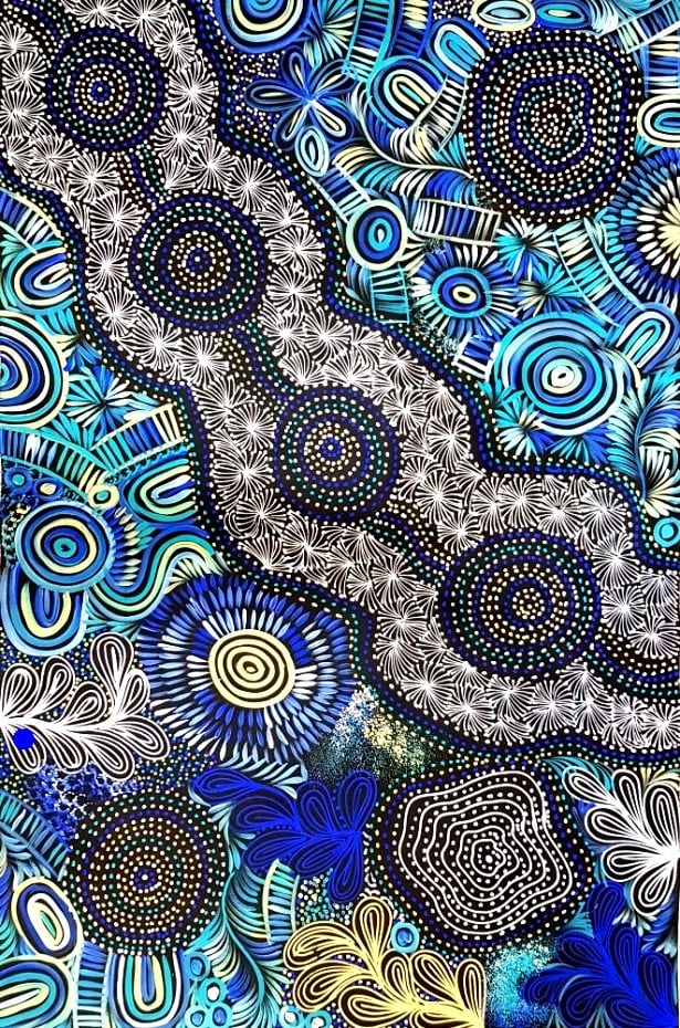 Women’s paintings often depict a topographical view of their country with stories related to women’s business, or initiation ceremony for women. The women may be past initiates, or young women awaiting instruction from older women. Initiates are taught their roles as nurturers of the land and keepers of the law by which life’s rules and regulations are set. Other stories involve bush medicine, seed dreaming and fire dreaming. Ceremonies always involve song, dance and body decoration. The ownership, management and performance are dependent upon knowledge and status. Body-painting carries deep spiritual significance for the Aboriginal people.