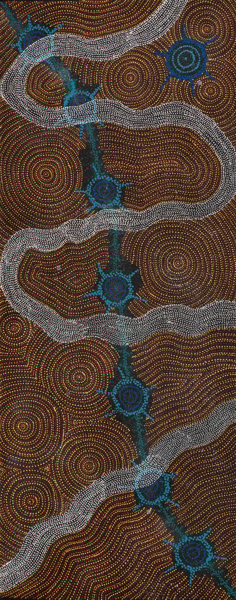 The site depicted in this painting is Puyurru, west of Yuendumu. In the usually dry creek beds are ‘mulju’ (soakages), or naturally occurring wells. The ‘kirda’ (owners) for this site are Nangala/Nampijinpa women and Jangala/Jampijinpa men. Two Jangala men, rainmakers, sang the rain, unleashing a giant storm. The storm travelled across the country from the east to the west, initially travelling with a ‘pamapardu Jukurrpa’ (termite Dreaming) from Warntungurru to Warlura, a waterhole 8 miles east of Yuendumu. At Warlura, a gecko called Yumariyumari blew the storm on to Lapurrukurra and Wilpiri. Bolts of lightning shot out at Wirnpa (also called Mardinymardinypa) and at Kanaralji. At this point the Dreaming track also includes the ‘kurdukurdu mangkurdu Jukurrpa’ (children of the clouds Dreaming). The water Dreaming built hills at Ngamangama using baby clouds and also stuck long pointy clouds into the ground at Jukajuka, where they can still be seen today as rock formations.