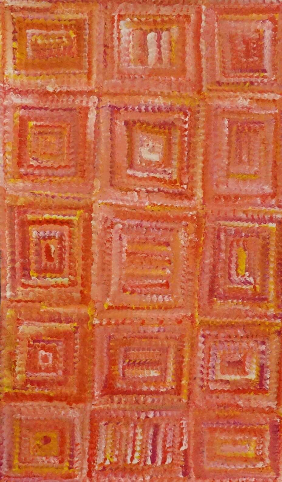 Sharon has painted Women’s Ceremony depicting the Tingari Cycle which shares the Dreaming story of a group of ancestral beings that emerged from the earth during the time of the creation. Her artwork depicts the ceremonial sites near her homelands at sunset in the vast desert country.