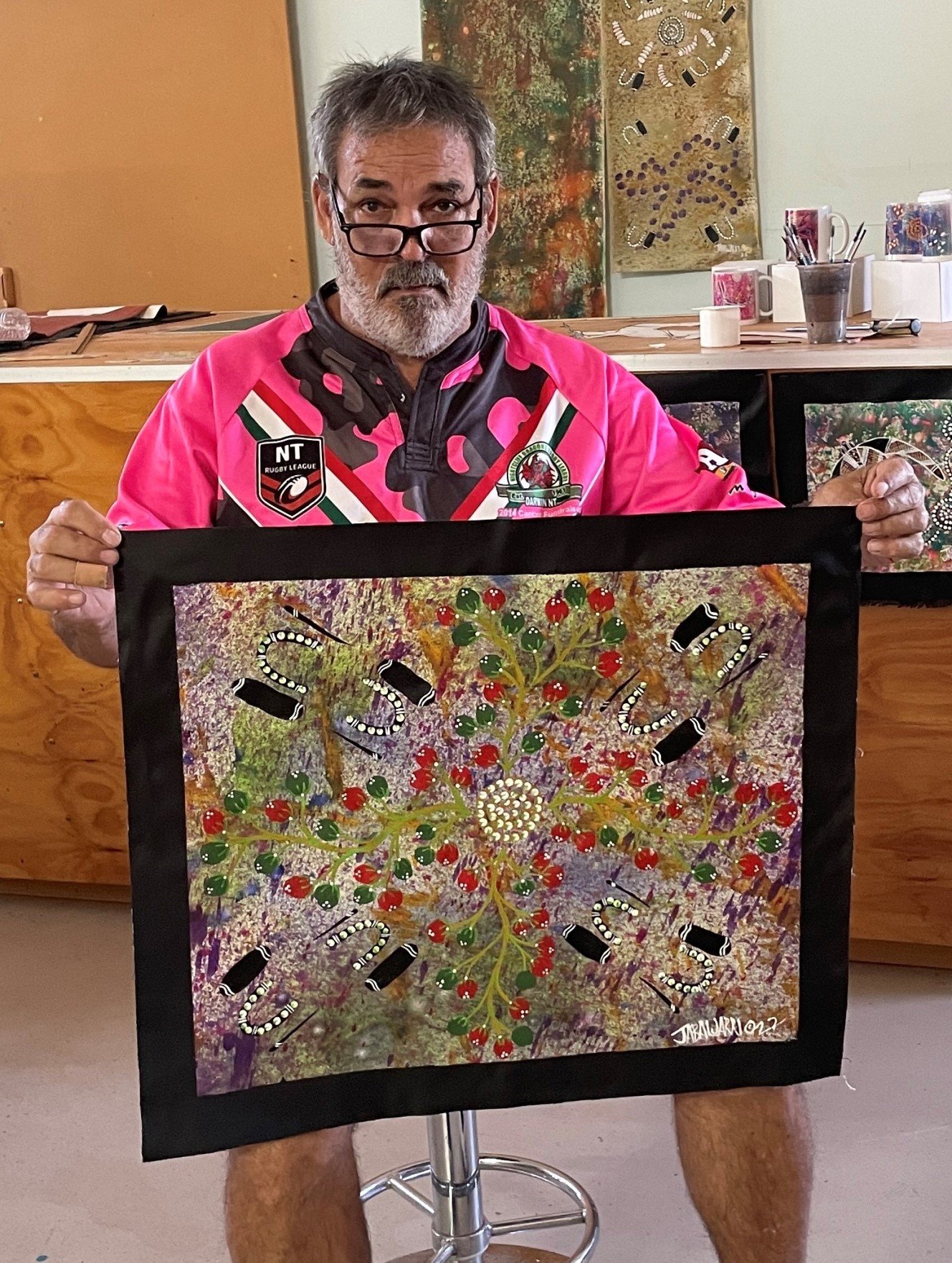 Steve began painting when he was 16 years old. He combines two styles of traditional painting which makes for his very contemporary artwork. The crosshatching work represents his Grandmother’s country, the Roper River region in the Northern Territory. Many of his family members come from the Jawoyn traditional lands which stretch across 50,000 square kilometres. It is from these family members that Steve learnt to paint in the ‘dot’ style. Dot paintings are now internationally recognised as unique and integral to Australian Aboriginal Art.