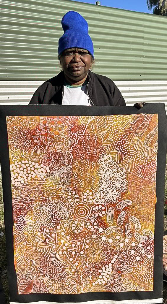 Tanya has painted a Women’s Dreaming story, combining her country with the bush tucker and waterholes that are imperative when the women go out bush for ceremony which can take up to a week.