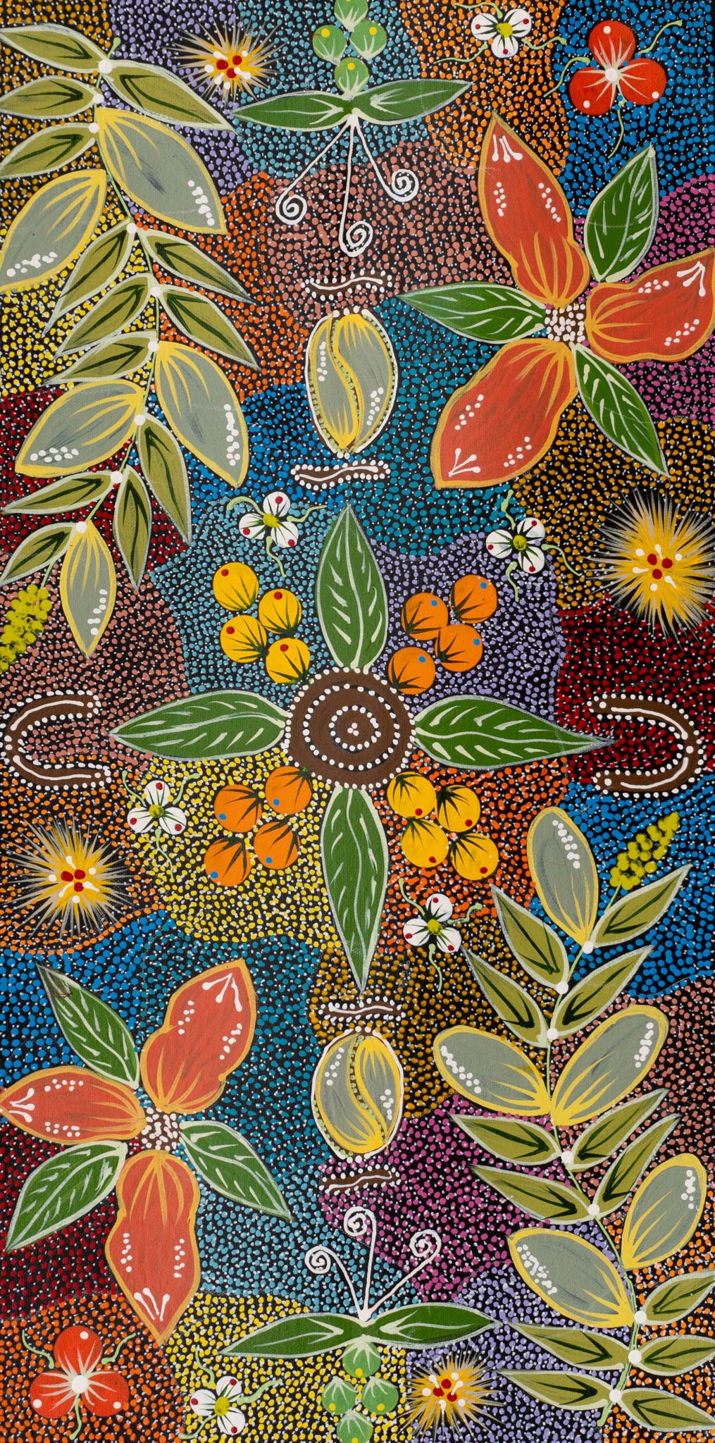 Tanya paints the bush tucker and flowers found in the harsh desert lands of Utopia. Annual rainfall is very low however after the winter rains, the country bursts into life with colourful flowers and bush foods. The women still go out to this day to collect these special plants, seeds and fruits which can be used for many things including as a food source rich with vitamins and bush medicine.