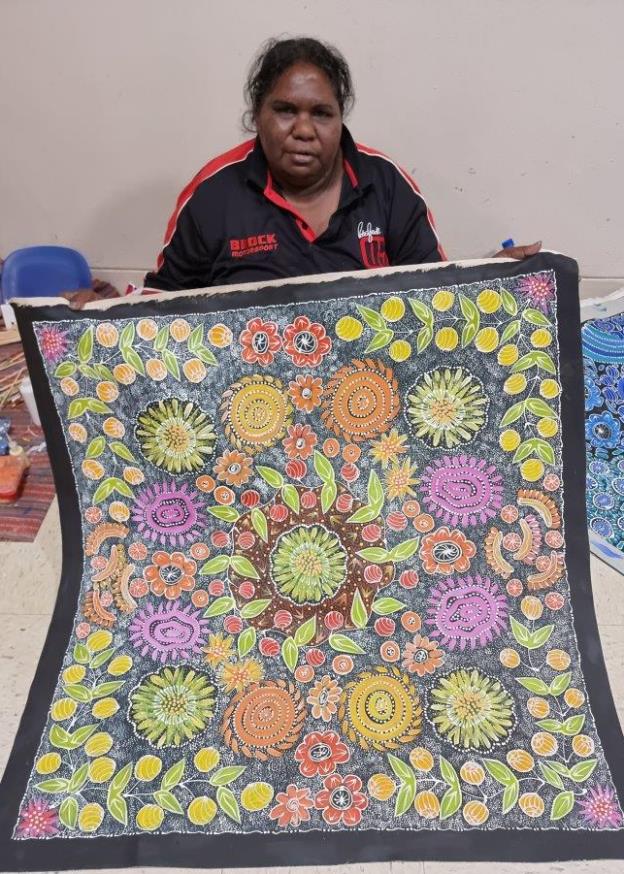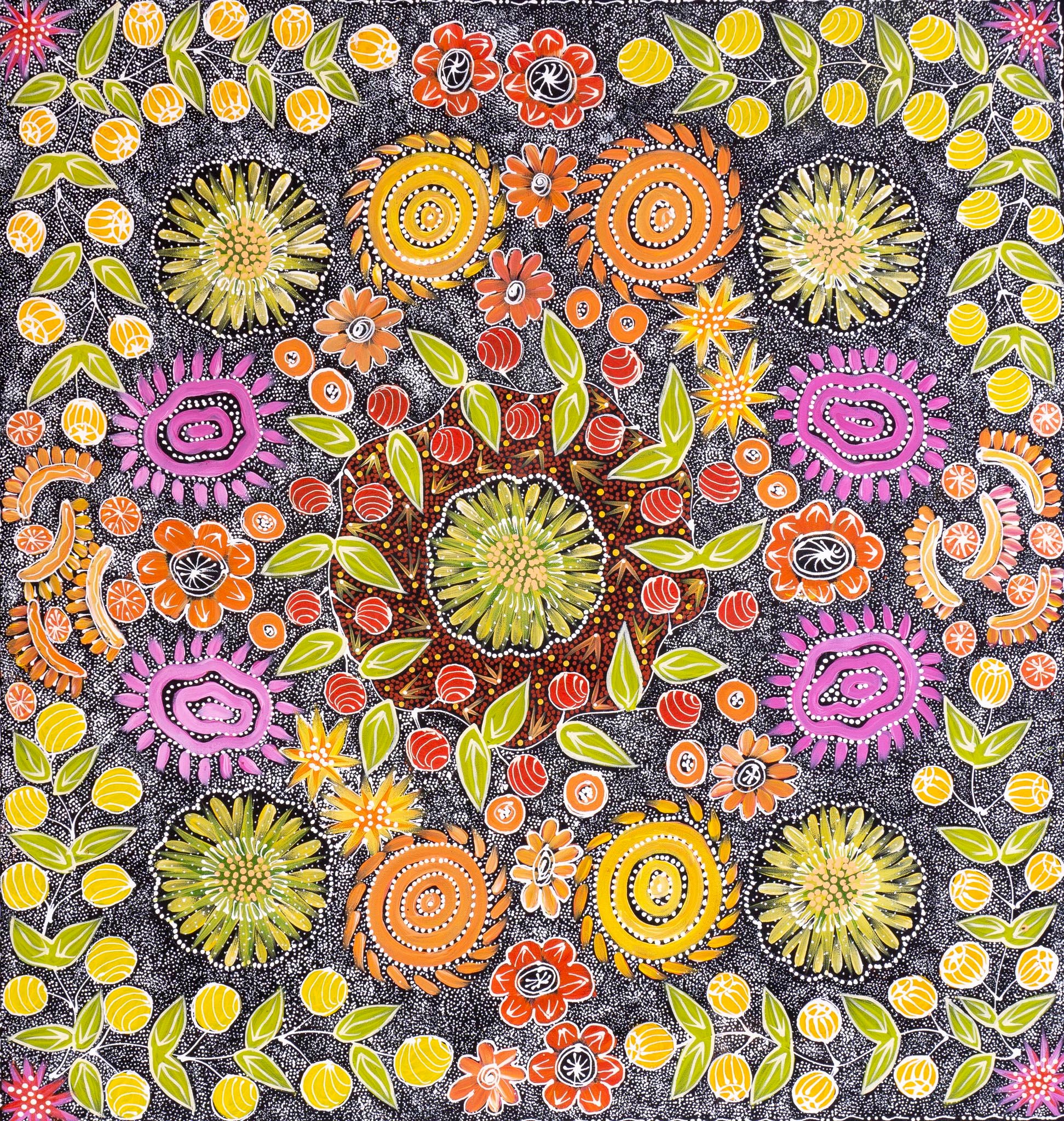 Tanya paints the bush tucker and flowers found in the harsh desert lands of Utopia. Annual rainfall is very low however after the winter rains, the country bursts into life with colourful flowers and bush foods. The women still go out to this day to collect these special plants, seeds and fruits which can be used for many things including as a food source rich with vitamins and bush medicine.