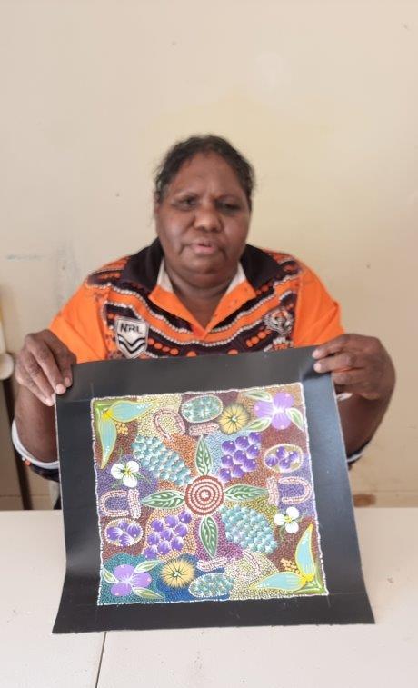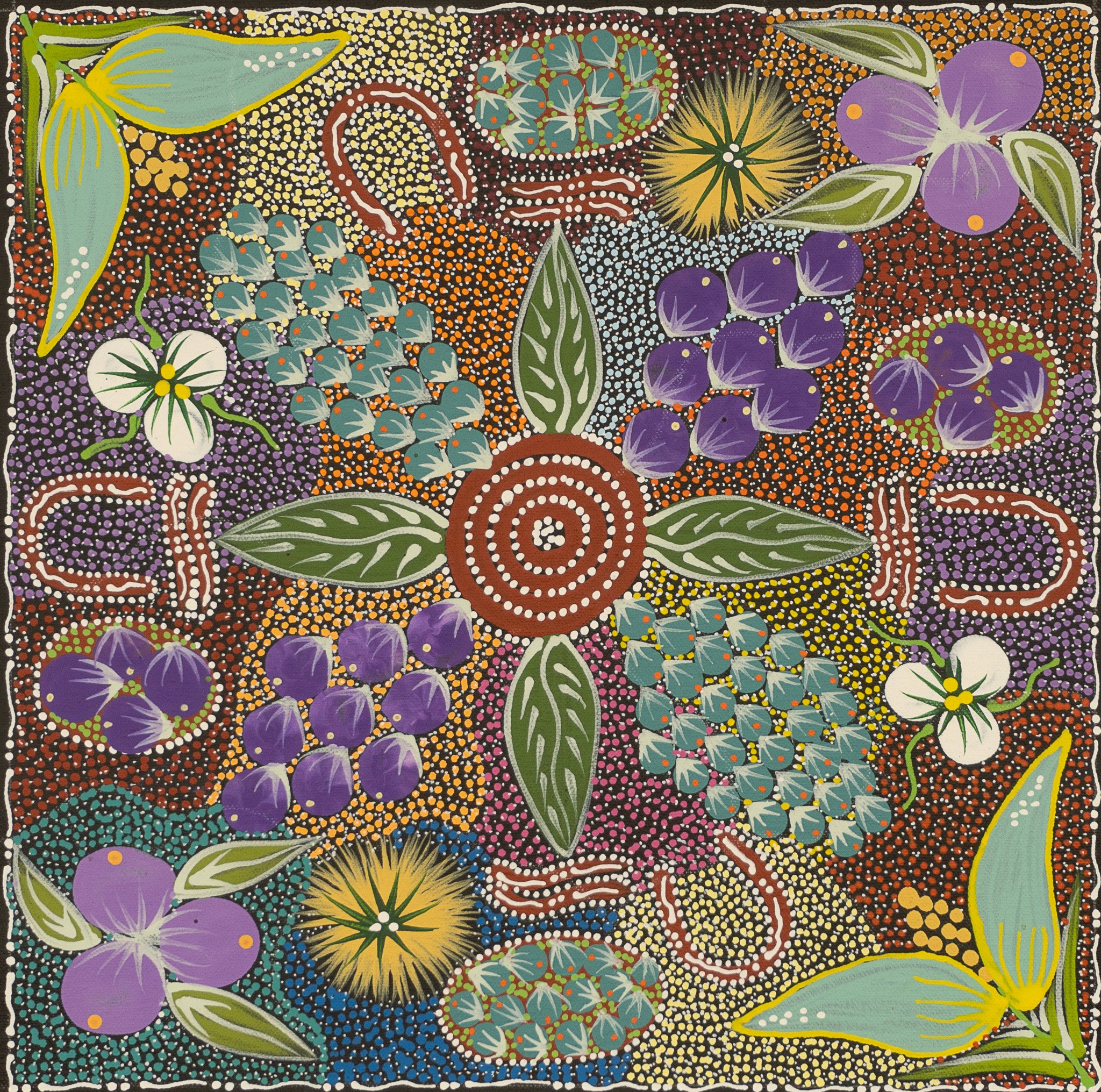 Tanya paints the bush tucker and flowers found in the harsh desert lands of Utopia. Annual rainfall is very low however after the winter rains, the country bursts into life with colourful flowers and bush foods. The women still go out to this day to collect these special plants, seeds and fruits which can be used for many things including as a food source rich with vitamins and bush medicine.