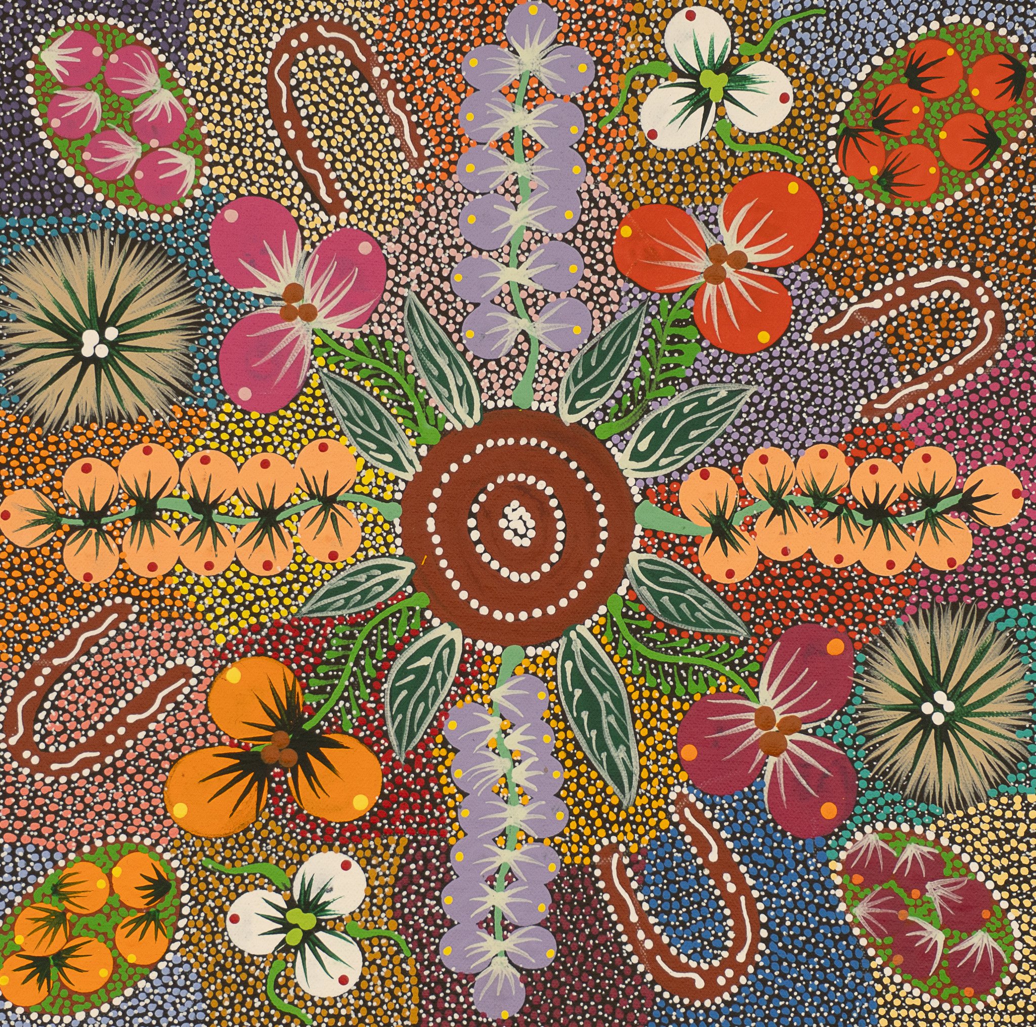 Tanya paints the bush tucker and flowers found in the harsh desert lands of Utopia. Annual rainfall is very low however after the winter rains, the country bursts into life with colourful flowers and bush foods. The women still go out to this day to collect these special plants, seeds and fruits which can be used for many things including as a food source rich with vitamins and bush medicine.