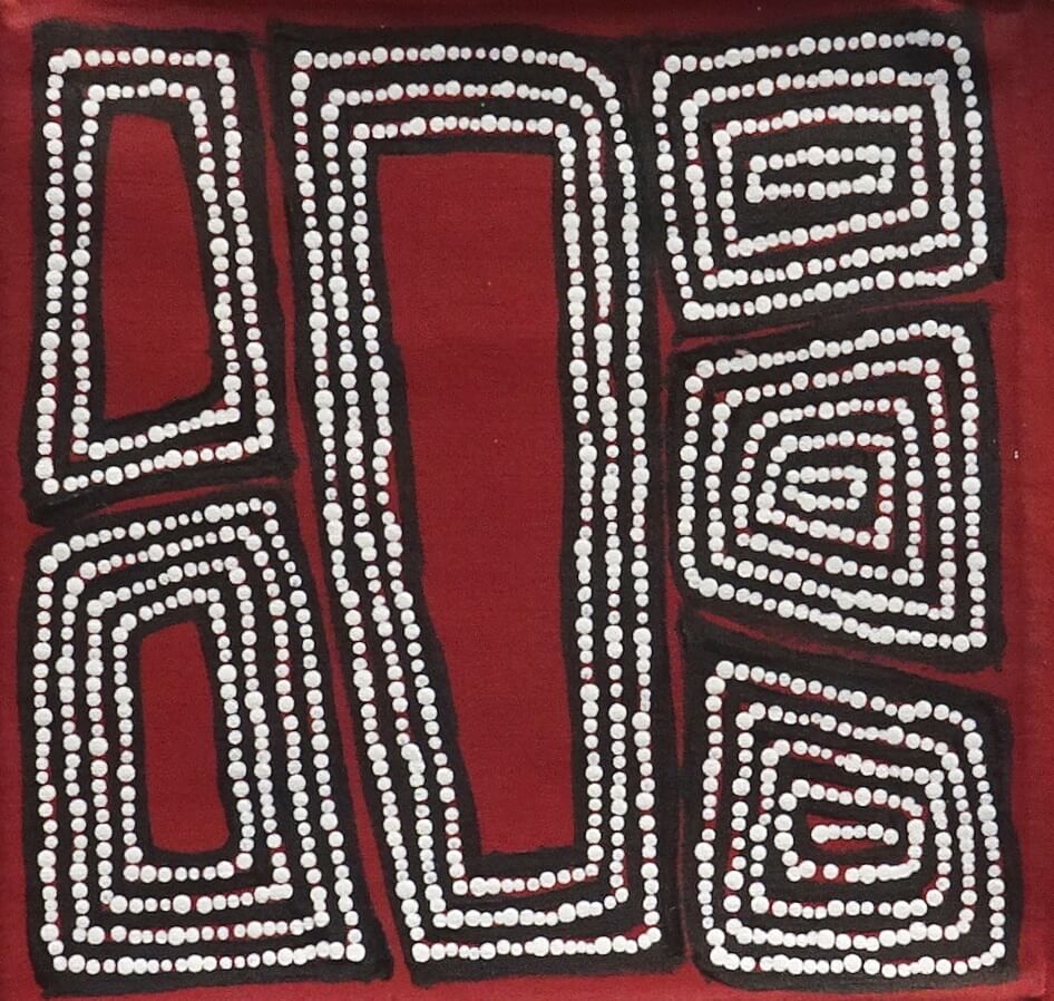 Thomas depicts his sacred terrain in a strikingly unique way. His work displays uncommon strength, mathematical balance and poetic harmony. The subject of his work is the Tingari Cycle, secret song cycles sacred to men. The Tingari are a group of Ancestor Beings who the country associated with Walala’s many Dreaming sites, stretching from near the West Australian border to Central Australia. These Dreaming Sites and songs are depicted in the traditional ochre colours of the desert.