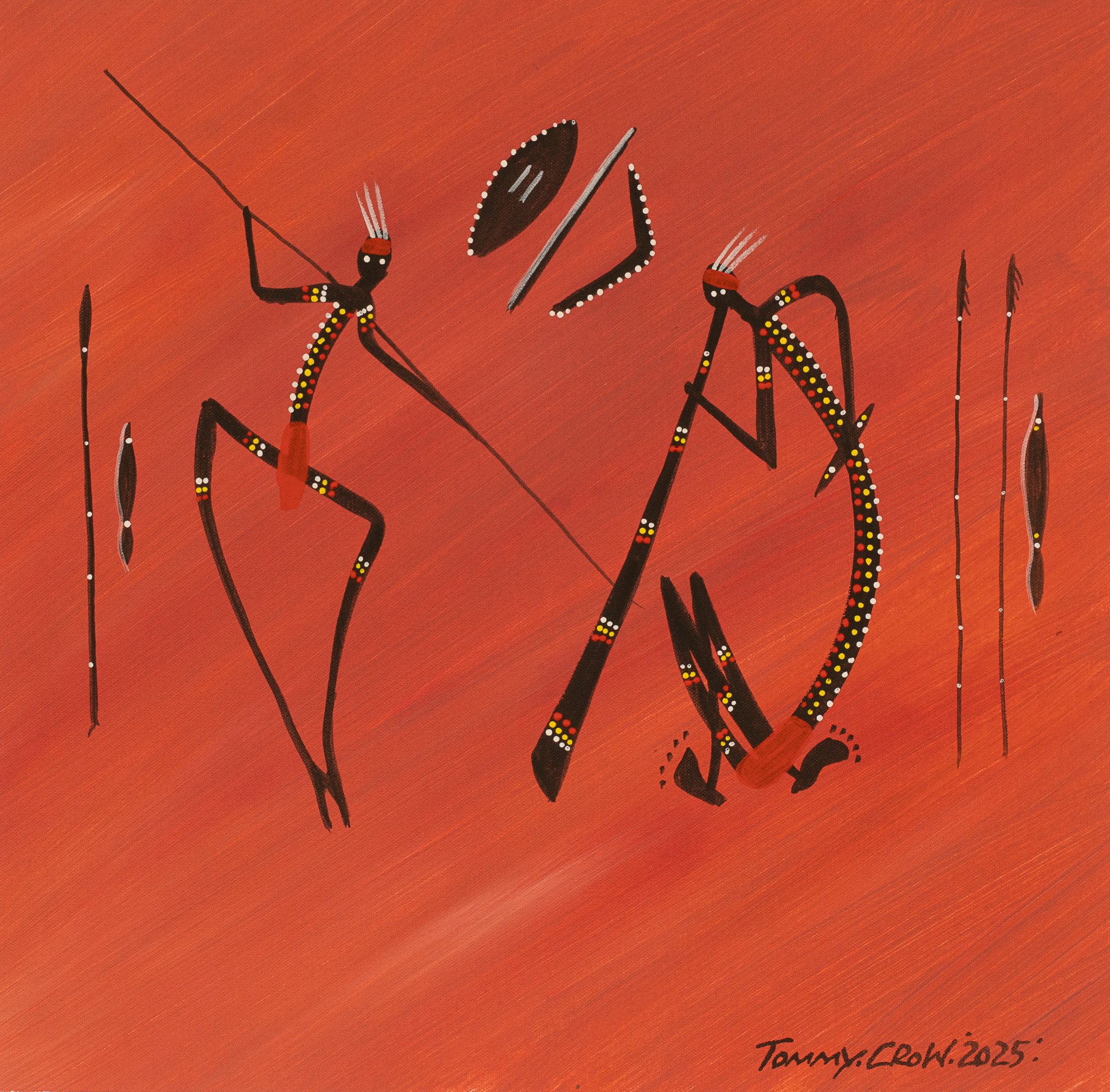 In this powerful painting, Tommy Crow presents a ceremonial scene featuring two Aboriginal men — one playing the didgeridoo and the other holding a spear — surrounded by traditional artefacts that carry both practical and spiritual meaning. The shield, boomerang, woomera (spear-thrower), and spears speak to the long-standing customs of hunting, protection, and ceremonial life that continue to this day.