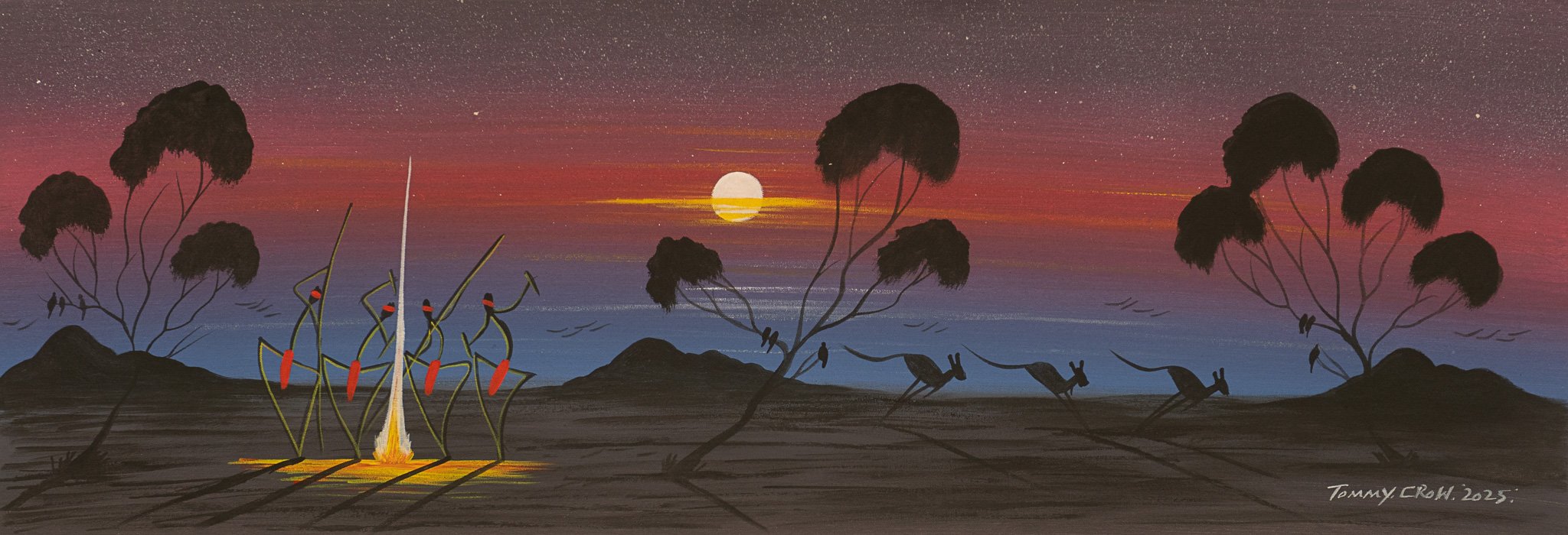 The artwork shows the desert country at sunset and the evening in Central Australia. The men will hunt for kangaroos and emus with boomerangs and spears as they make their way across the desert. Aboriginal boys are taught the skill of hunting in preparation for their initiation into manhood. The aboriginal men depicted in the paintings are holding a ceremony as they dance around the camp fire.