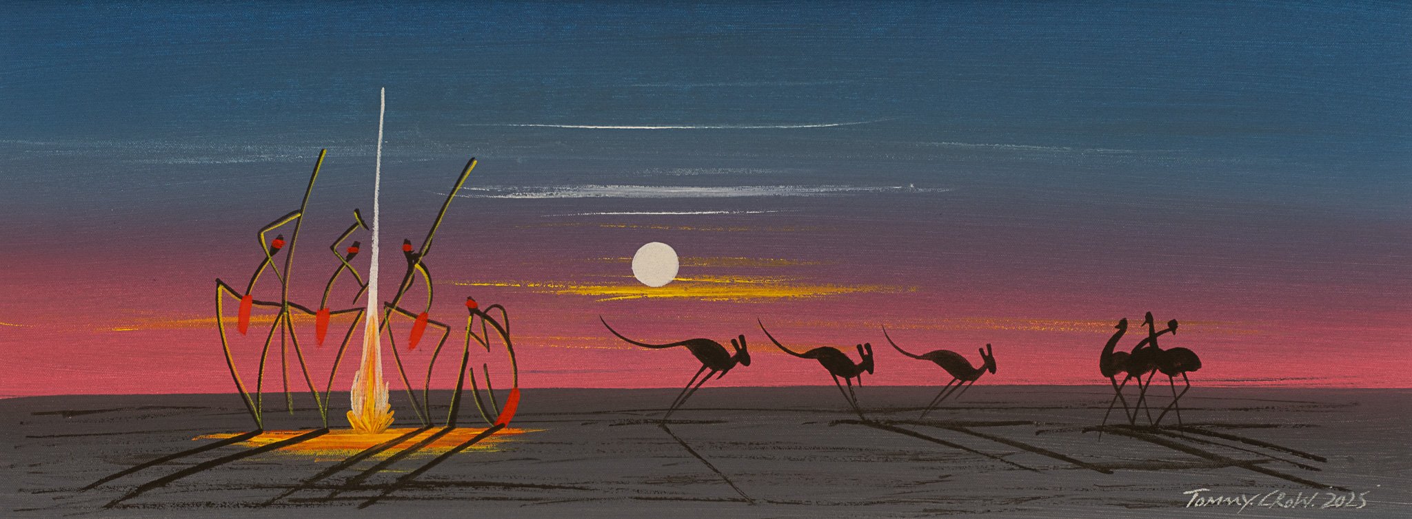 The artwork shows the desert country at sunset and the evening in Central Australia. The men will hunt for kangaroos and emus with boomerangs and spears as they make their way across the desert. Aboriginal boys are taught the skill of hunting in preparation for their initiation into manhood. The aboriginal men depicted in the paintings are holding a ceremony as they dance around the camp fire.