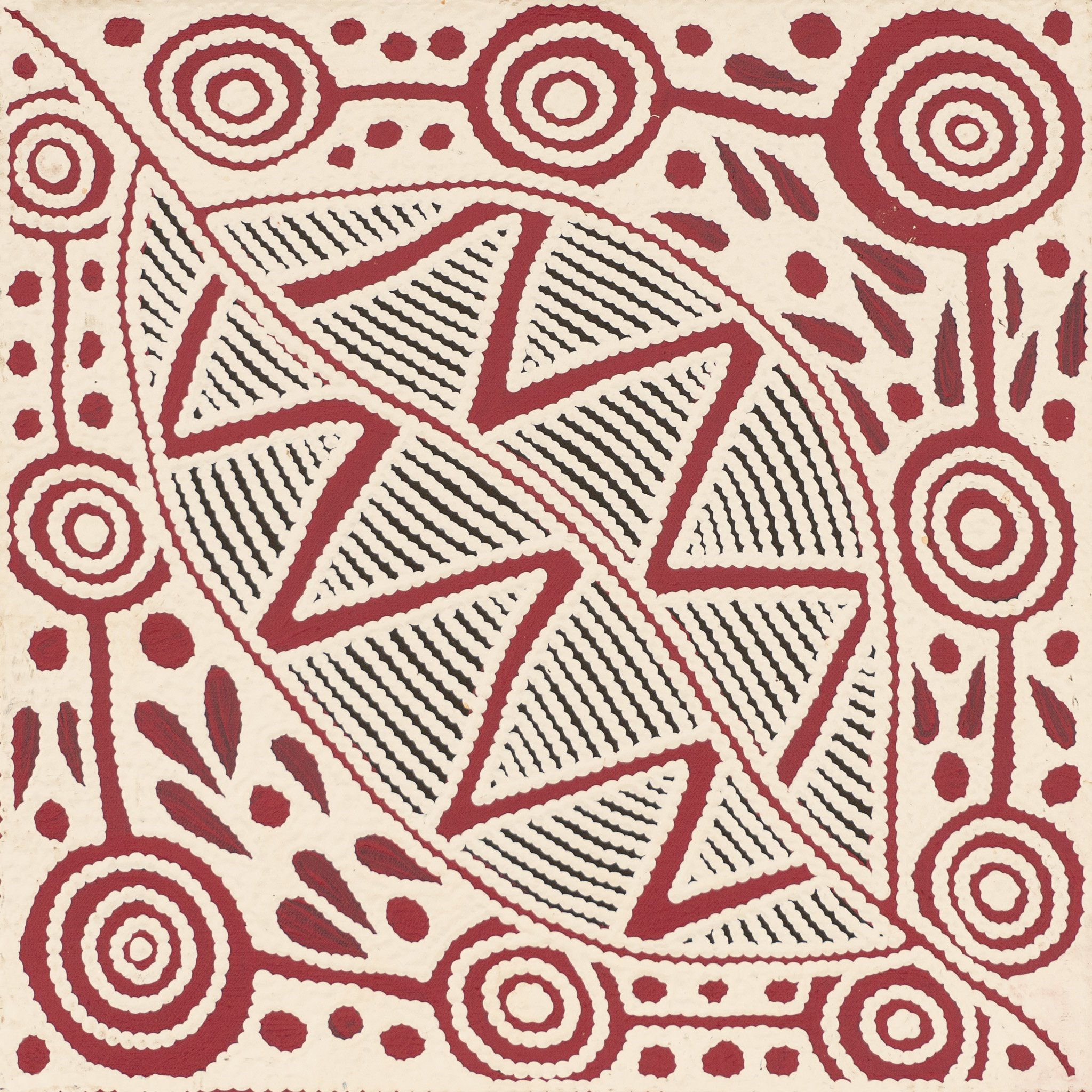 Ursula paints her father’s Yuparli Jukurrpa (Bush Banana Dreaming) and Pikilyi Jukurrpa (Vaughan Springs Dreaming), which her Aunty taught her and her mother’s Ngapa Jukurrpa (Water Dreaming). These dreamings have been passed down the generations for millennia and relate directly to the land, its features and the plants and animals that inhabit it. Ursula uses an unrestricted palette to develop a modern interpretation of her traditional culture.