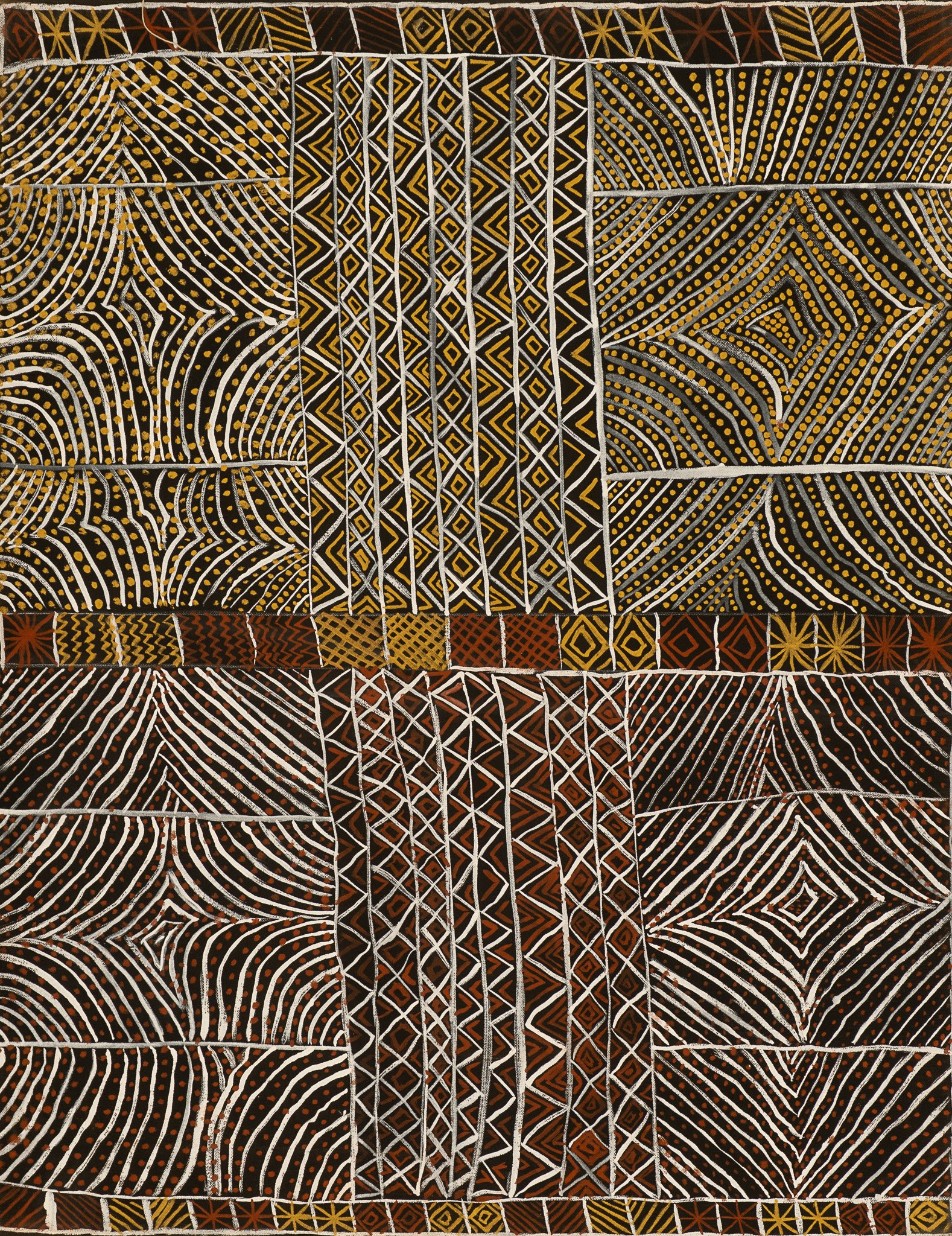 During ceremony on the Tiwi Islands a series of ‘yoi’ (dances), are performed; some are totemic (inherited from the person’s Mother) and some serve to act out the narrative of newly composed songs. Participants in these ceremonies are painted with turtiyanginari (the different natural ochre colours) in varying designs, transforming the dancers and, in some cases, providing protection against recognition by mapurtiti (spirits). These designs can be applied in different ways, one of which is using the finger, or in this case a brush. Painting of the face also occurs. These significant artistic designs collectively are called ‘Jilamara’.